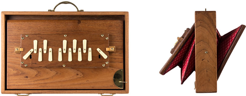The M2 was developed as an option to the darker coloured M1 Shruti Box. Made from ‘tun’ a solid hard-wood traditionally used to make Sarods, the M2 has a characteristic bright, warm and clear tone throughout the frequency range. With less immersive resonance than the M1, it is popular with singers who enjoy hearing their voice distinct from the drone.